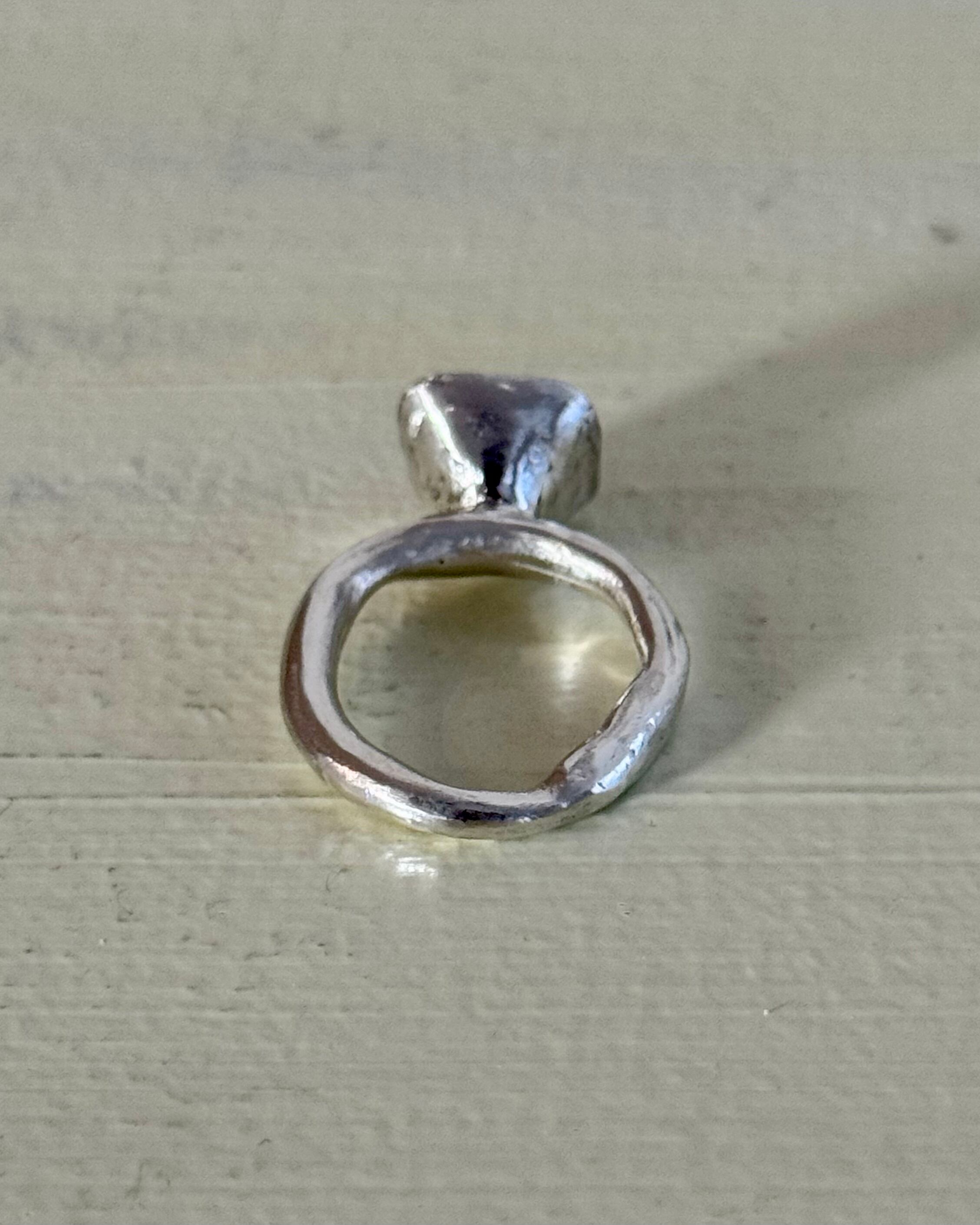 マットな質感のシルバーが、石のシャープなカットと深みを一層引き立てます。