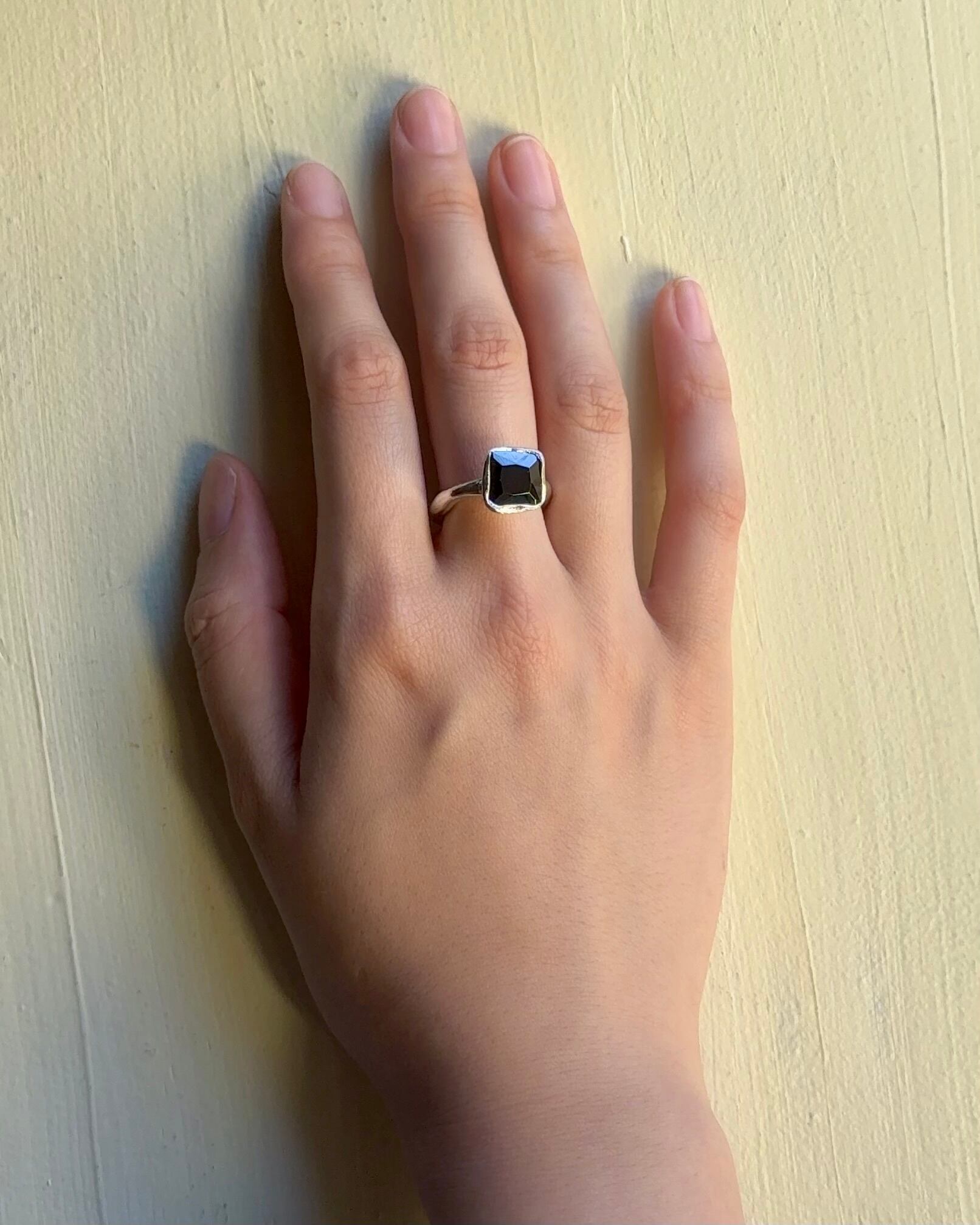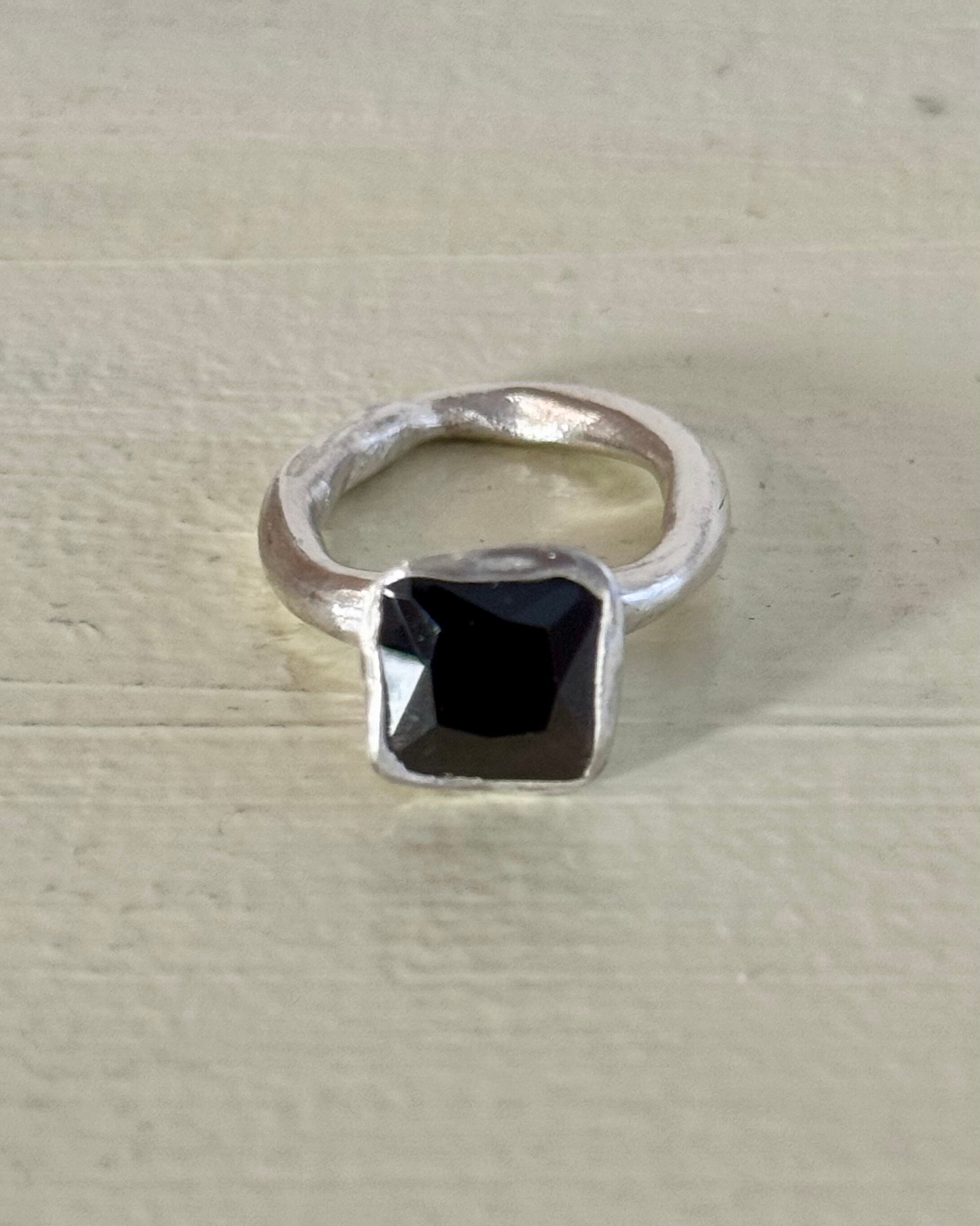 漆黒の輝きを放つスクエアカットのブラックジルコニアを、ハンドメイドならではの有機的なフォルムのシルバーアームにセッティングしました。