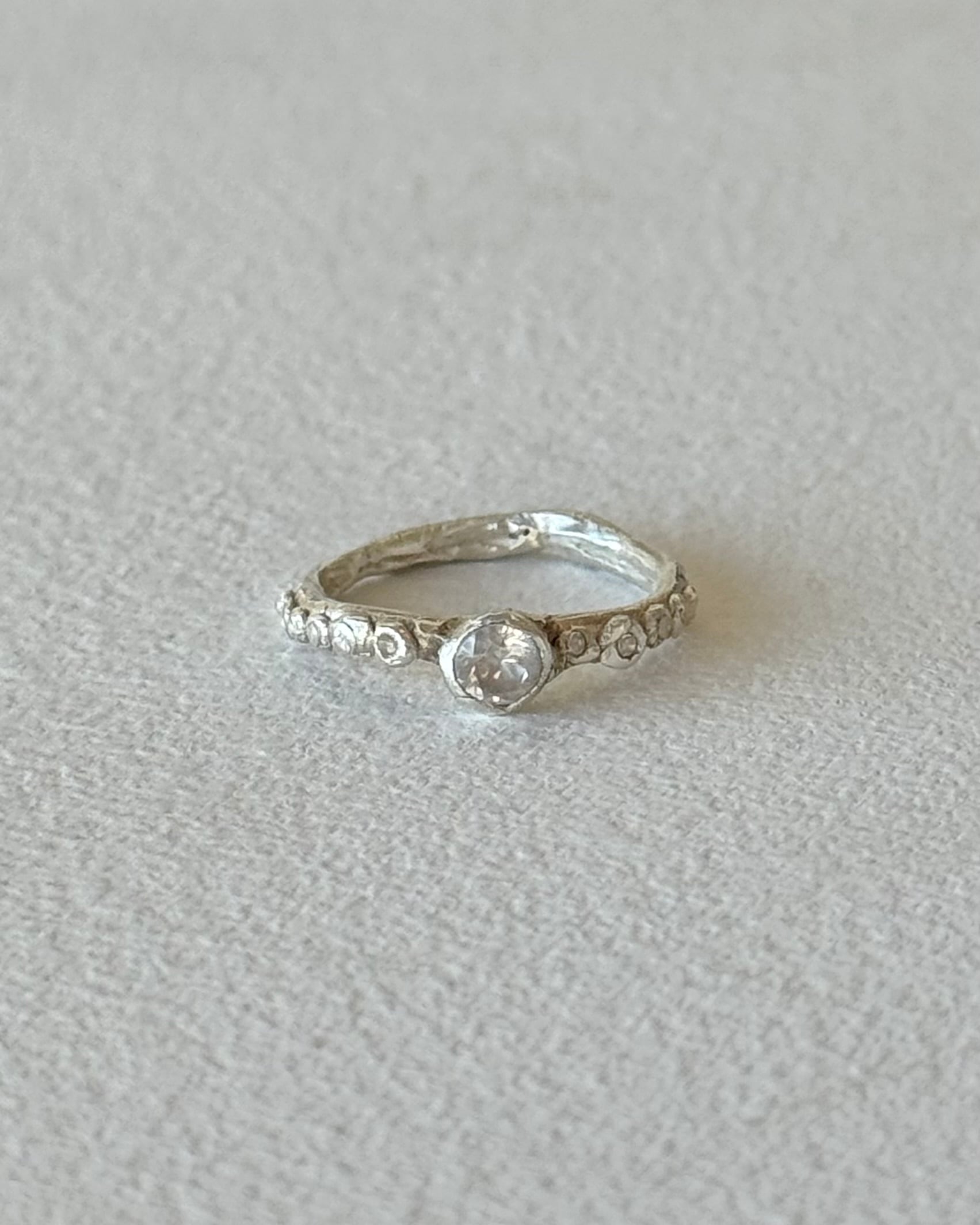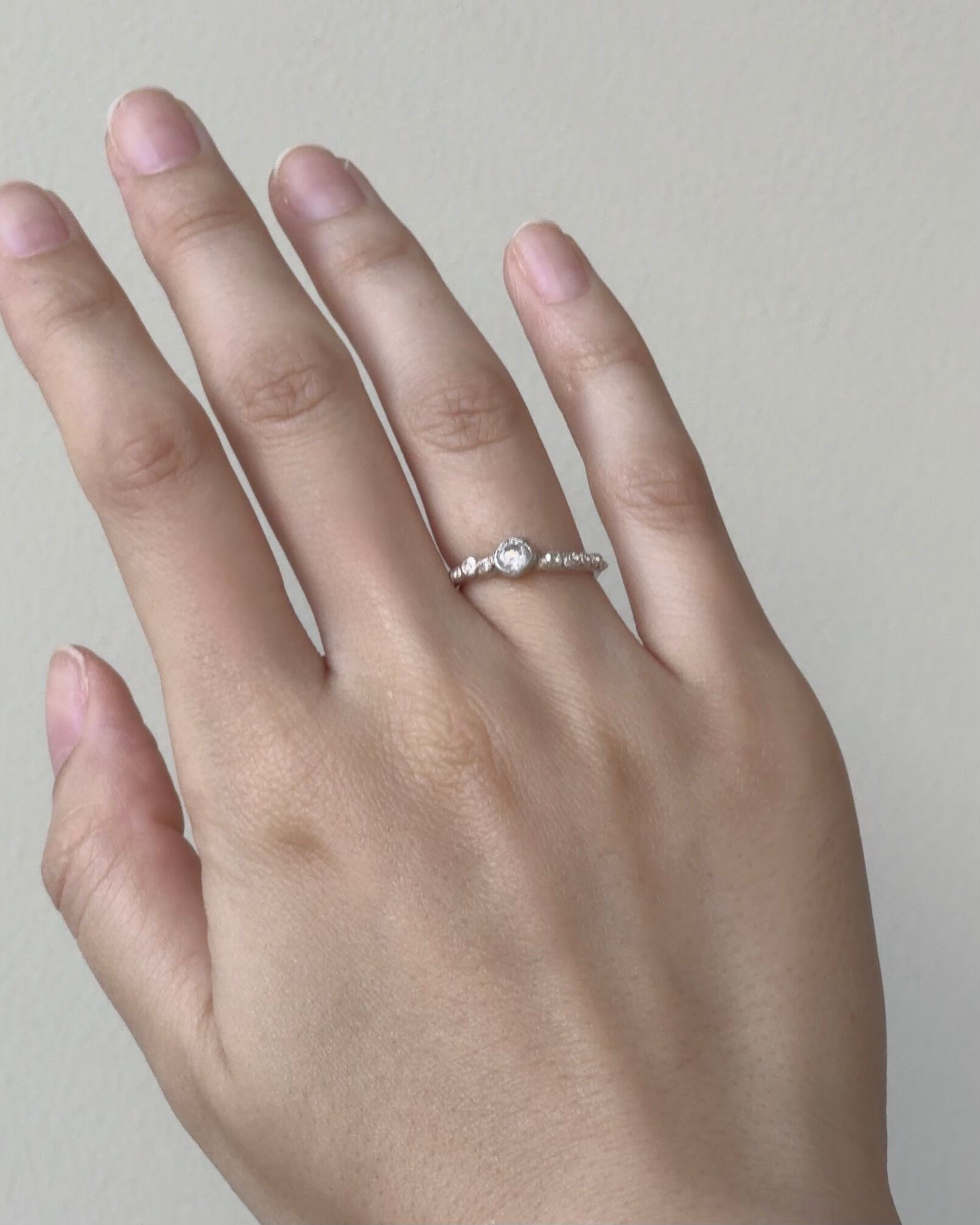 左右には細かな石を、中央には小ぶりなストーンを配し、主張しすぎない上品なきらめきを添えています。